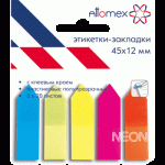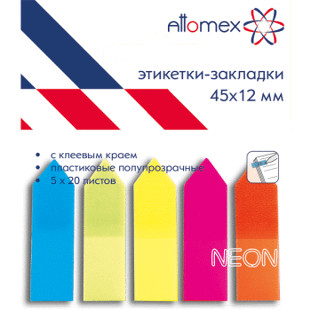 Набор самоклеящихся этикеток-закладок “Attomex” пластиковые полупрозрачные в форме стрелки 45×12 мм, 5×20 листов, 5 неоновых цветов, в пластиковом пакете с европодвесом