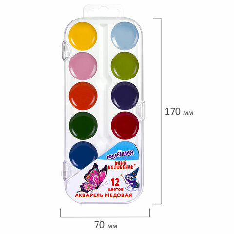 Краски акварельные ЮНЛАНДИЯ “ЮНЫЙ ВОЛШЕБНИК”, медовые, 12 цветов, круглые кюветы, пластик